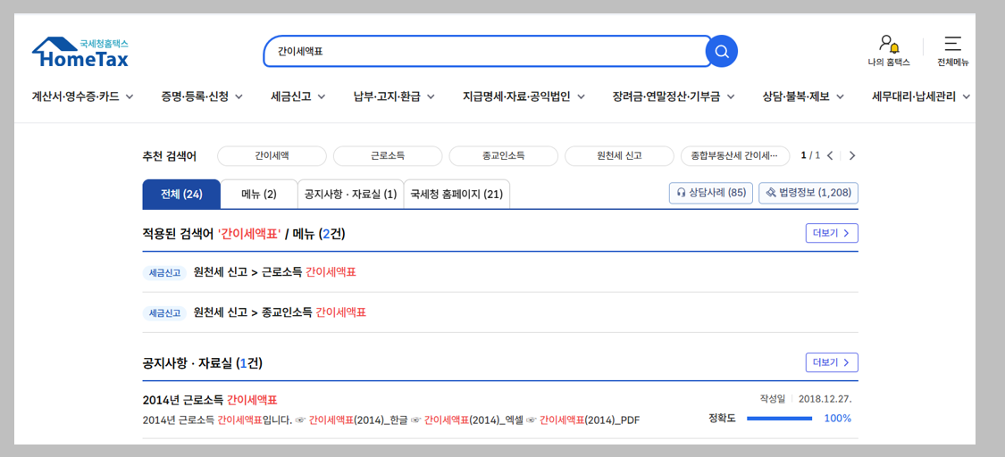 - '조회/발급' 메뉴에서 '간이세액표'를 선택합니다. 처음에는 메뉴 찾기가 어려울 수 있는데, 상단 메뉴를 천천히 살펴보시면 됩니다.