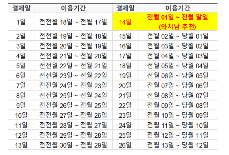 제가 추천드리는 결제일이 바로 14일 입니다.