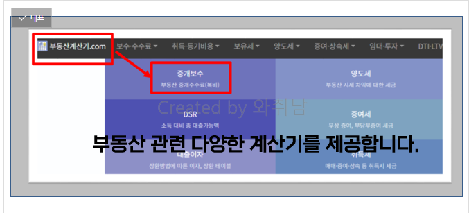 부동산계산기를 검색하여 접속한 후 여러 가지 메뉴 중 중개보수를 선택합니다.