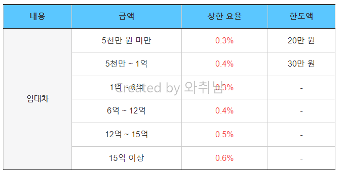 | 임대차 | 5천만 원 미만 | 0.3% | 20만 원 |