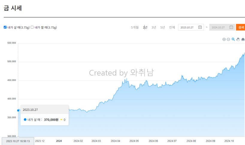 1년전인 2023년 10월 27일의 순금 시세는 370,000원이었습니다. 12개월만에 40% 이상 올랐습니다.