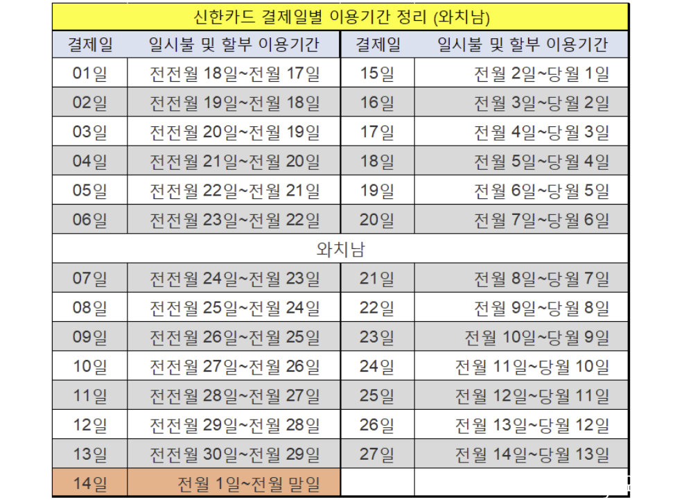 오늘은 신한카드 결제일별 사용기간을 정리했습니다. 그리고 사용 내역 확인과 전월 실적과 혜택 챙기기는 날짜는 14일이 좋은 이유를 알아봤습니다. 감사합니다.