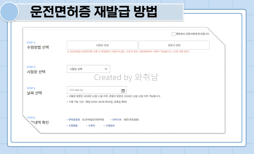 6) 면허증 종류와 수령 방법, 날짜를 고릅니다.