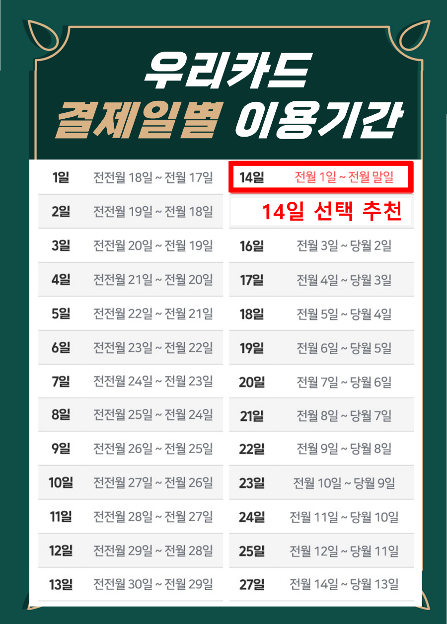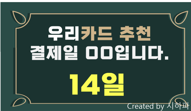 그래서 오늘은 우리카드 결제일별 용기간을 확인하는 방법을 알아보겠습니다. 그리고 지급일은 14일로 설정하는 게 좋은데요, 그 이유에 대해 알아보겠습니다.