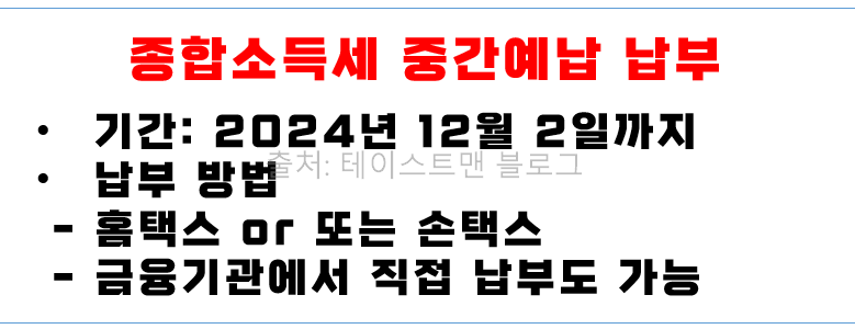 여기까지 11월 종합소득세 중간예납에 대해 알아보았습니다. 도움이 되셨길 바라겠습니다