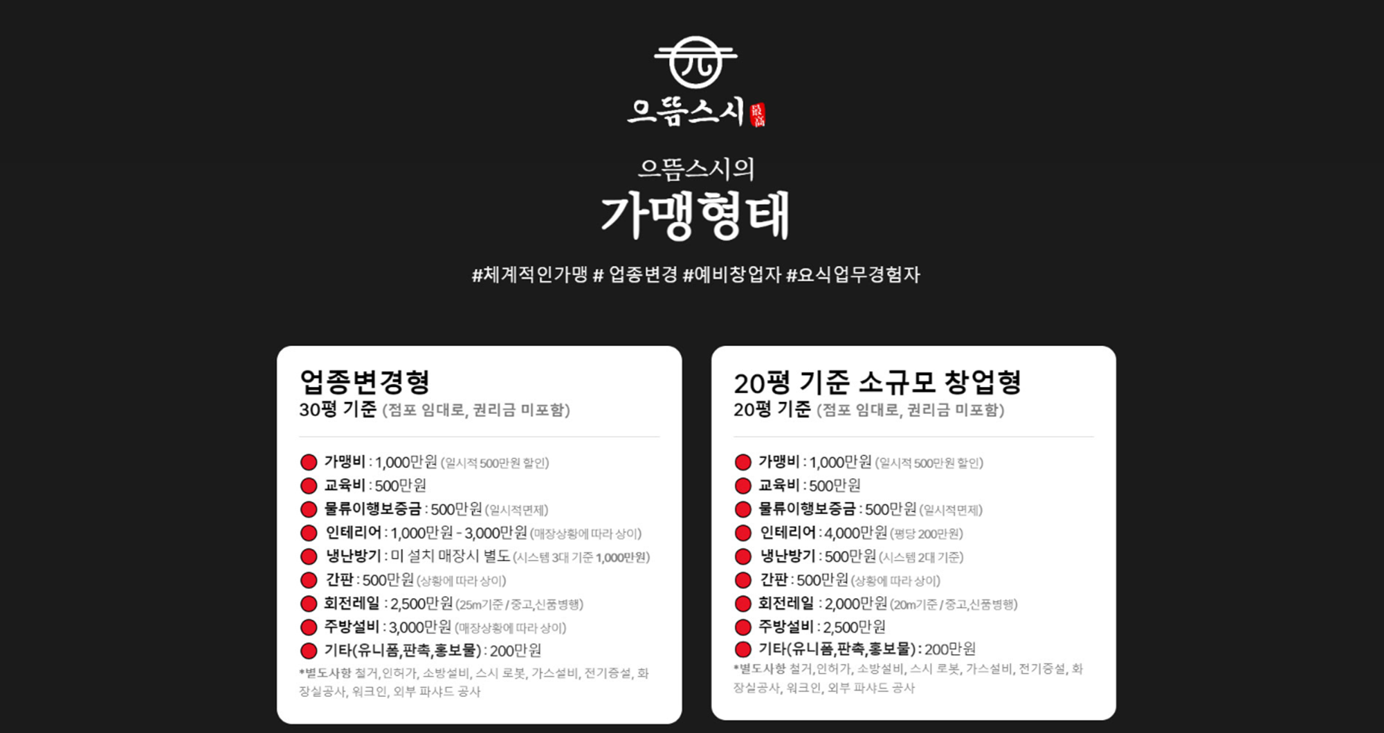 현재는 모듬스시라는 프렌차이즈를 검토하고고 있습니다. 20평대 기준으로 총 투자비용이 1억 원 정도 든다고 하는데, 퇴직금으로 가능한 금액이라 다행입니다. 다만 권리금과 임대료는 별도라서 이 부분은 좀 더 고민이 필요할 것 같네요.