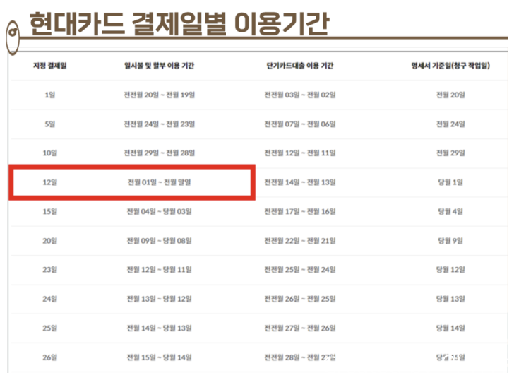 - 현대카드 결제일별 사용 기간