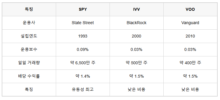 SPY는 거래 역사가 가장 길고 거래량이 풍부합니다. 단기 거래나 트레이딩에 적합해요. IVV와 VOO는 운용보수가 더 낮아서 장기 투자에 유리합니다. 배당 수익률은 비슷하지만 IVV와 VOO가 약간 더 높은 편입니다.